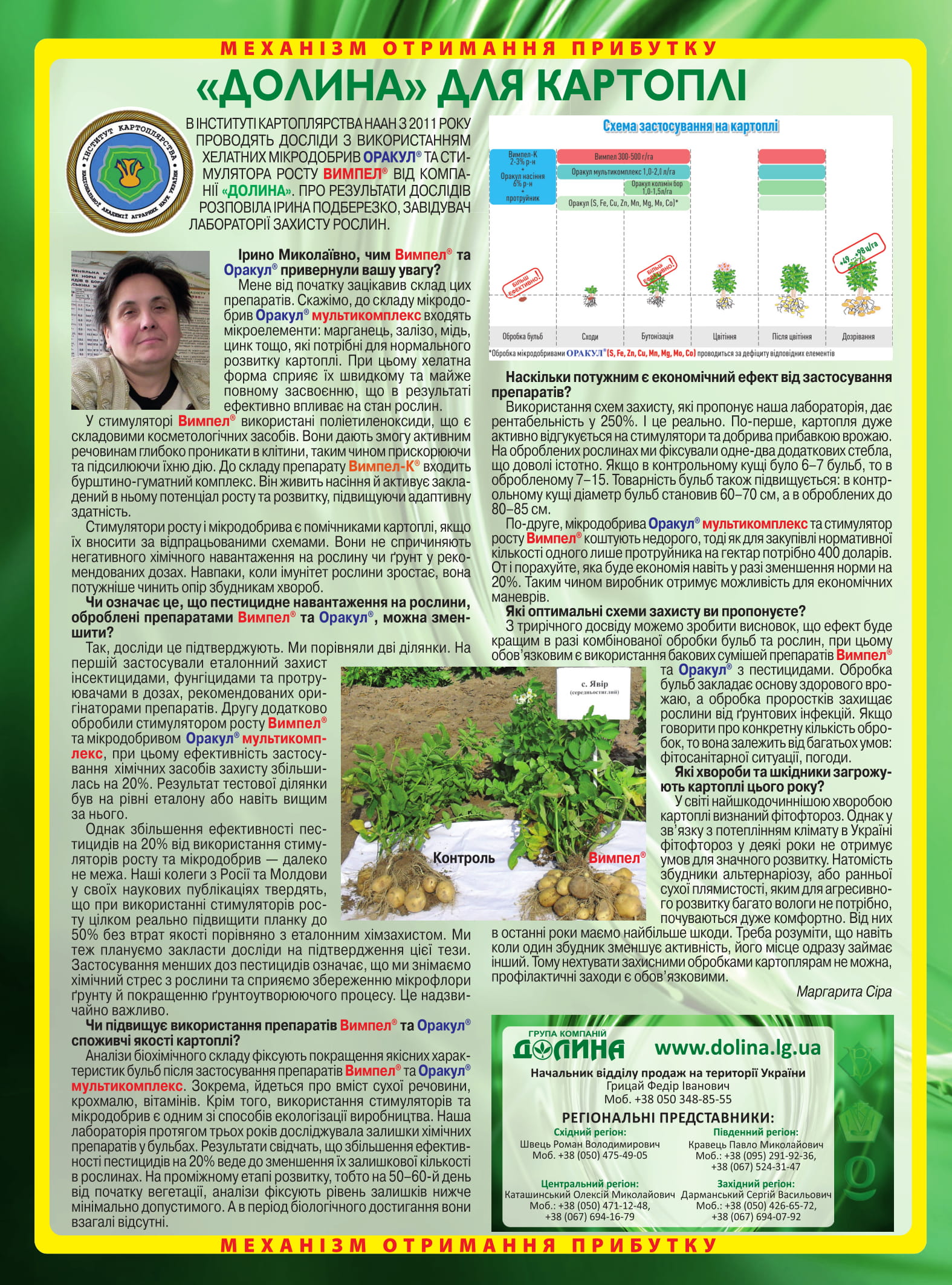 В Інституті картоплярства НААН з 2011 року проводять досліди з використанням хелатних мікродобрив ОРАКУЛ® та стимулятора росту ВИМПЕЛ® від компанії «Долина». Про результати дослідів розповіла Ірина Подберезко, завідувач лабораторії захисту рослин.