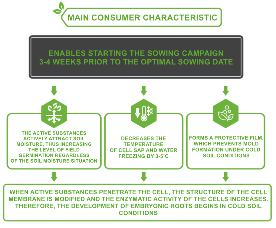 - due to its hydrophilic properties (active substances actively attract soil moisture), it ensures stable seed swelling and increases the level of field germination regardless of soil moisture conditions;