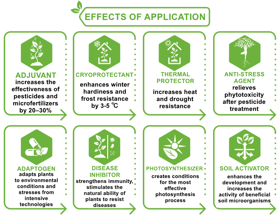 Cultivated plants react to pesticide treatment by synthesizing specific stress proteins and enzymes that neutralize the resulting negative effects. The complex of modified humic acids and low-molecular-weight polyhydric alcohols accelerates metabolic processes in plant tissues, which manifest themselves in a more intensive synthesis of anti-stress substances, enhances the photosynthetic productivity of chloroplasts in cells, which in turn removes phytotoxicity after pesticide treatment.