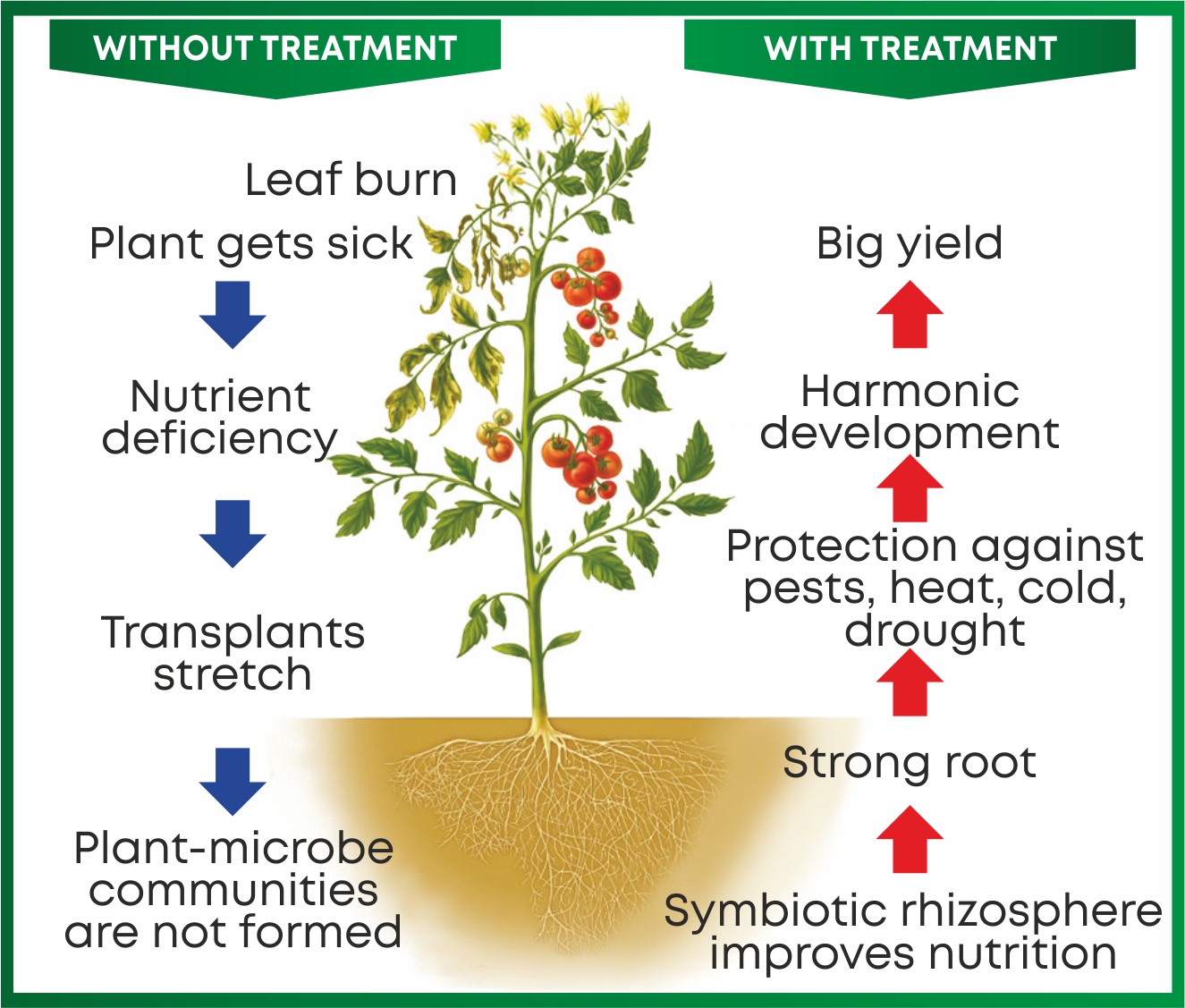 - promotes active growth of roots and intense acquirement of the vegetative mass;