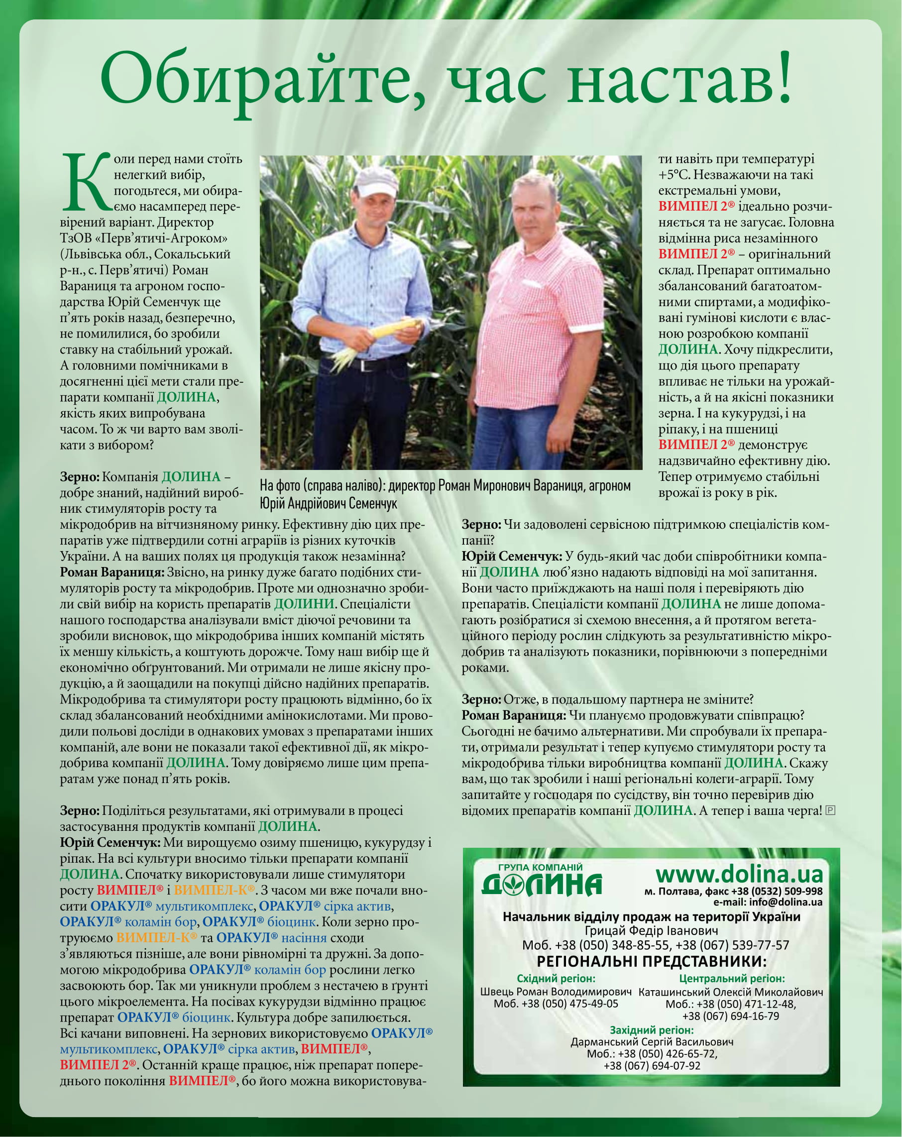 Коли перед нами стоїть нелегкий вибір, погодьтеся, ми обираємо насамперед перевірений варіант. Директор ТзОВ «Перв’ятичі-Агроком» (Львівська обл., Сокальський р-н., с. Перв’ятичі) Роман Вараниця та агроном господарства Юрій Семенчук ще п’ять років назад, безперечно, не помилилися, бо зробили ставку на стабільний урожай. А головними помічниками в досягненні цієї мети стали препарати компанії ДОЛИНА, якість яких випробувана часом. То ж чи варто вам зволікати з вибором?