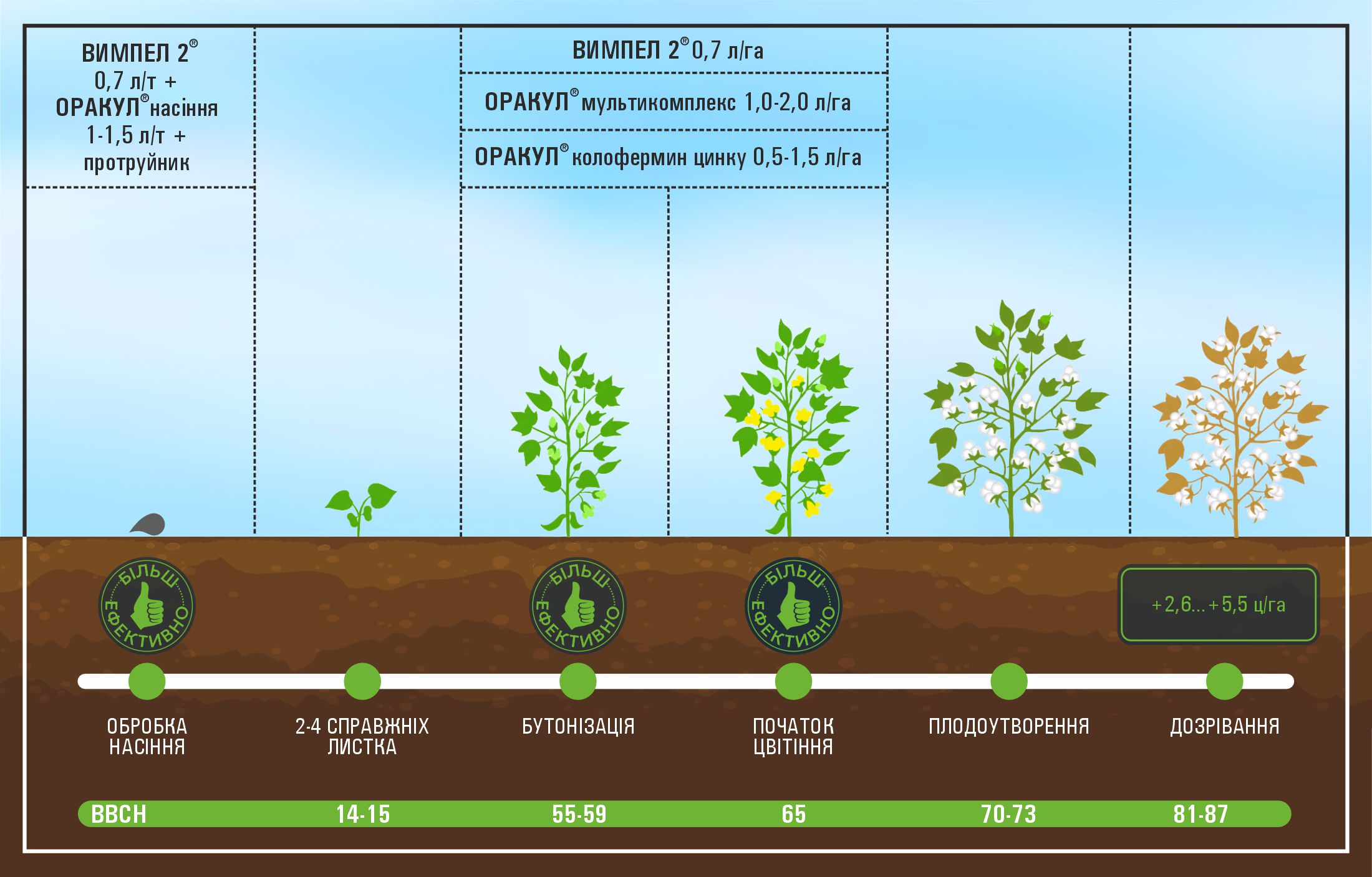 обробка насіння ВИМПЕЛ®-К + ОРАКУЛ® насіння і обробка у фазі бутонізації ВИМПЕЛ 2® + ОРАКУЛ® мультикомплекс, а також повторна обробка у фазі початок цвітіння ВИМПЕЛ 2® + ОРАКУЛ® мультикомплекс збільшує врожайність бавовнику на 5,5 ц/га.