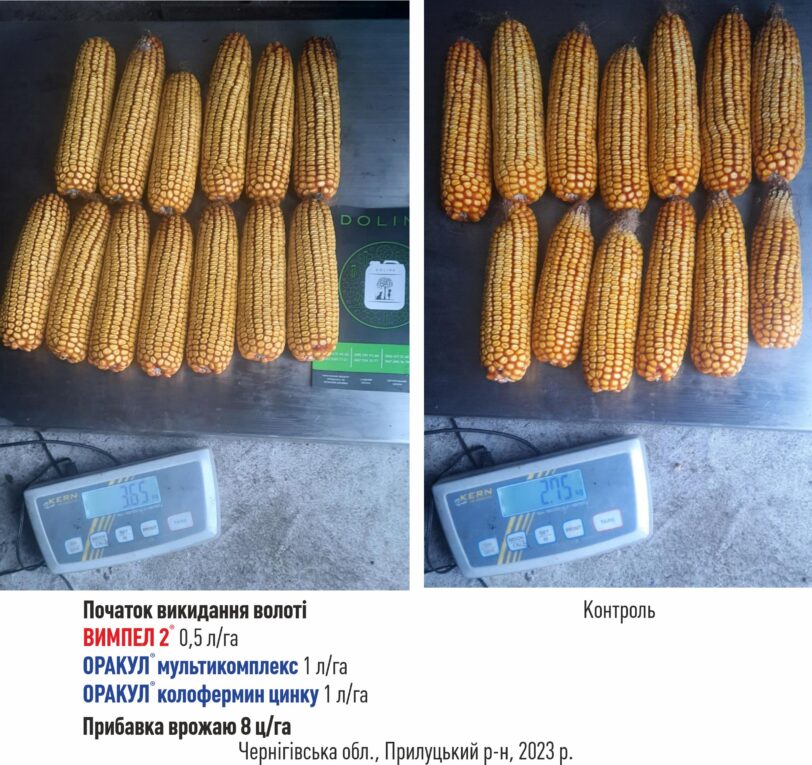 - додавання до попередньої схеми обробки у фазі 7-8 листів ВИМПЕЛА 2® збільшує прибавку на 7,3 ц/га, а з ВИМПЕЛ 2® + ОРАКУЛ® мультикомплекс вона сягає 8,7 ц/га;