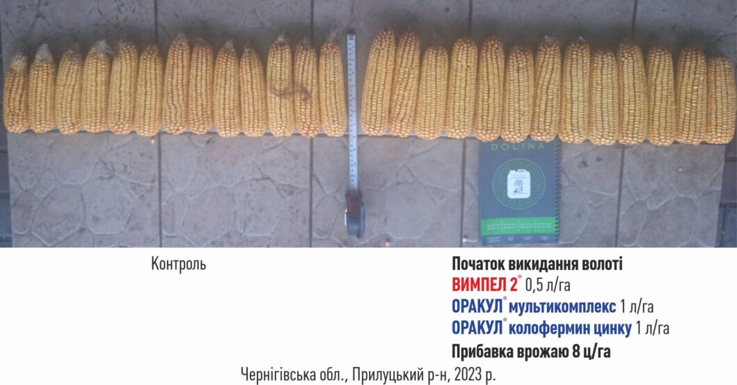 При застосуванні мікродобрива ОРАКУЛ® колофермин цинку нормою 1,0-2,0 л/га, за умови попередньої обробки насіння препаратом ВИМПЕЛ®-К, прибавка до врожаю складає 2,1 ц/га, а з додаванням ОРАКУЛ® насіння – 3,6 ц/га.