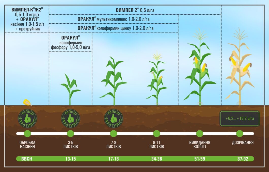 Технологія також включає мікродобриво ОРАКУЛ® колофермин фосфору (1 – 4 л/га), яке забезпечує повноцінний ріст і розвиток рослин кукурудзи, до того ж сприяє підвищенню врожайності.
