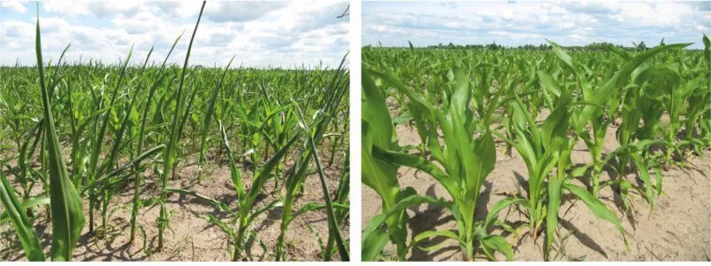 Слева — контроль, справа — обработанные растения. Обратите внимание на действие препарата в качестве термопротектора на кукурузе (фото справа).