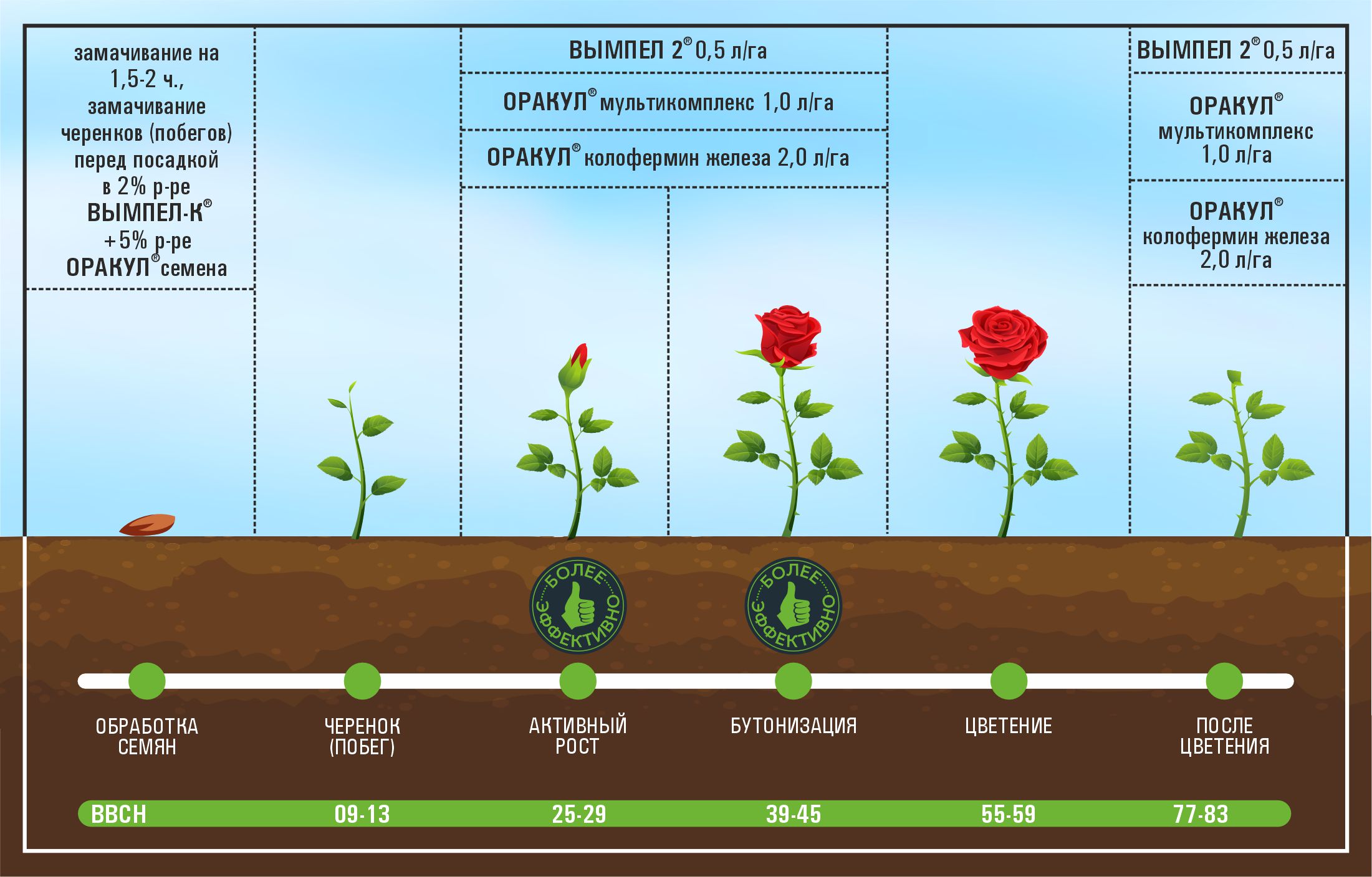 Применение стимулятора роста ВЫМПЕЛ 2® с микроудобрениями серии ОРАКУЛ® в технологии выращивания цветочных культур (обработки в фазах активного роста, до цветения и после цветения) и декоративных культур (2-3 обработки в период активного роста побегов) дает наибольший эффект.