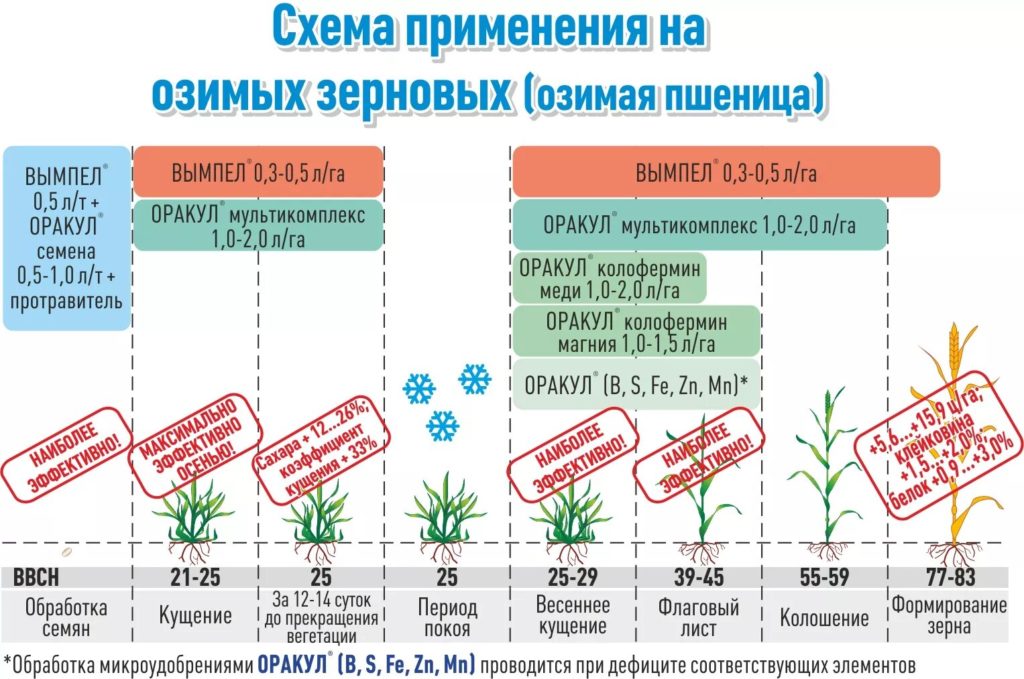 В результате многолетнего применения препарата ВЫМПЕЛ® и микроудобрений серии ОРАКУЛ® была разработана следующая схема применения на озимых культурах.